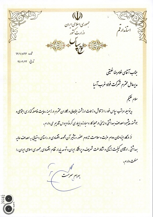 طی مراسمی مورخ 99/02/23 به پاس تلاش و زحمات ارزشمند جناب آقای مهندس خلیقی مدیریت محترم عامل شرکت فولاد غرب آسیا در زمینه رعایت فاصله گذاری اجتماعی و هوشمند ، پیشبرد اهداف بهداشتی و ایمنی در محیط کار و مبارزه با بیماری کرونا لوح سپاس از طرف استاندار محترم استان قم به ایشان اهداء گردید.