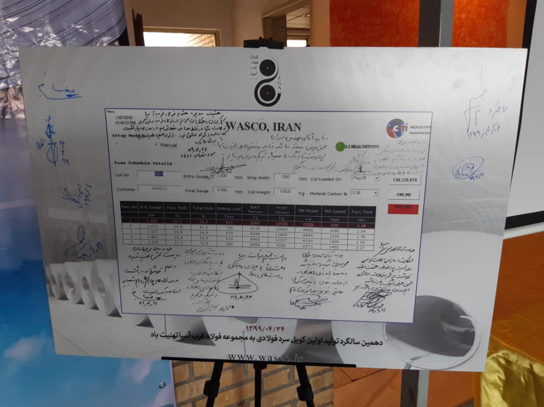 با حضور ریاست محترم هیات مدیره جناب آقای دکتر عاطفی فر و همینطور مدیریت محترم عامل شرکت فولاد غرب آسیا جناب آقای مهندس خلیقی و مدیران و کارشناسان آن شرکت با رعایت پروتوکول های بهداشتی  مراسم گرامیداشت دهمین سالگرد تولید اولین کویل سرد نورد دیده در شرکت فولاد غرب آسیا برگزار شد.